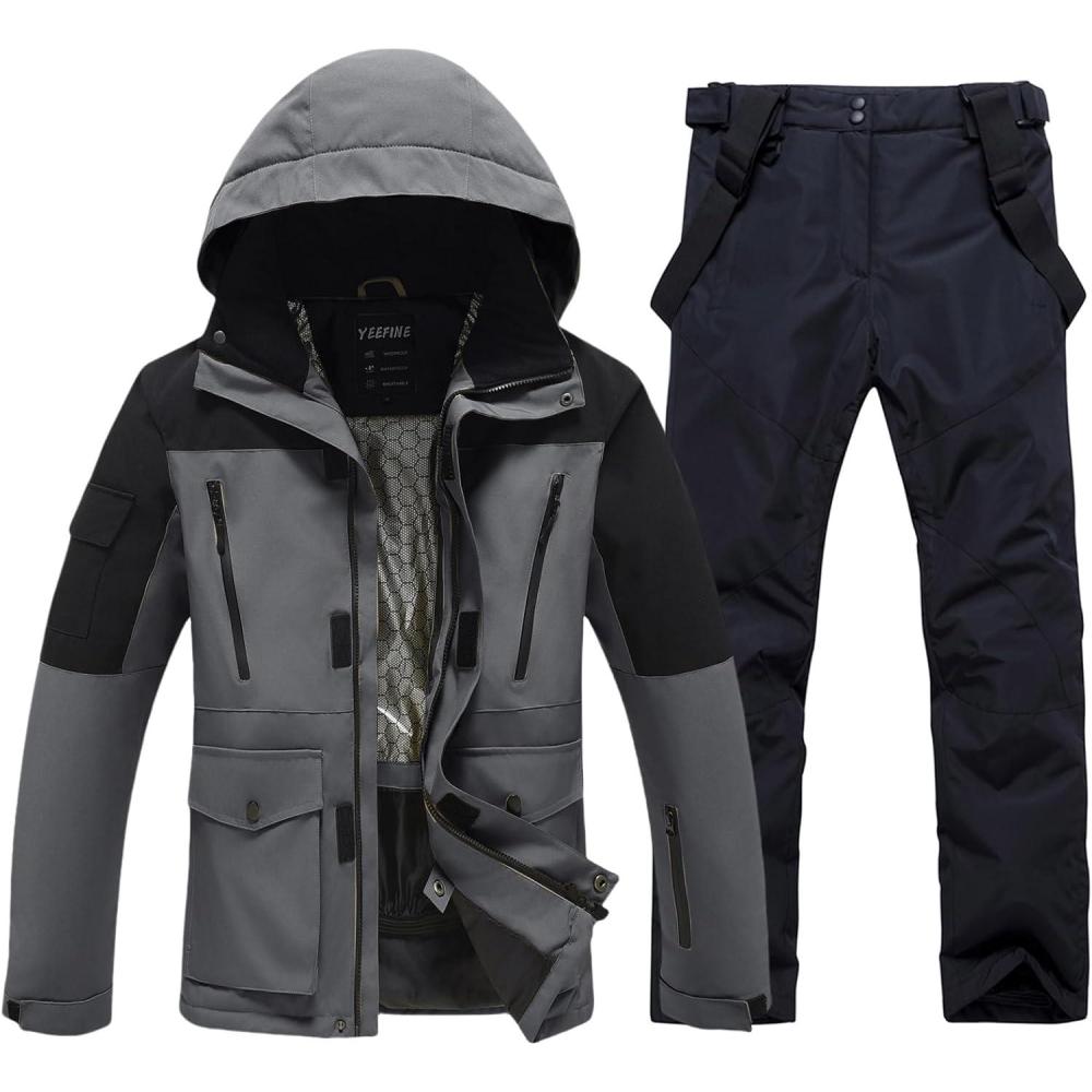 Men’s Jacket and Pants Set Insulated Waterproof Waterproof Snowboard Snowsuits for Snow Sport(#01gy+black)