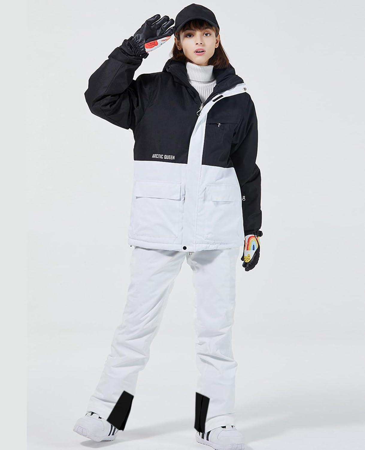Women’s Ski Jackets and Bib Pants Set Windproof Waterproof Insulated Snowsuit(#133bkw+white)